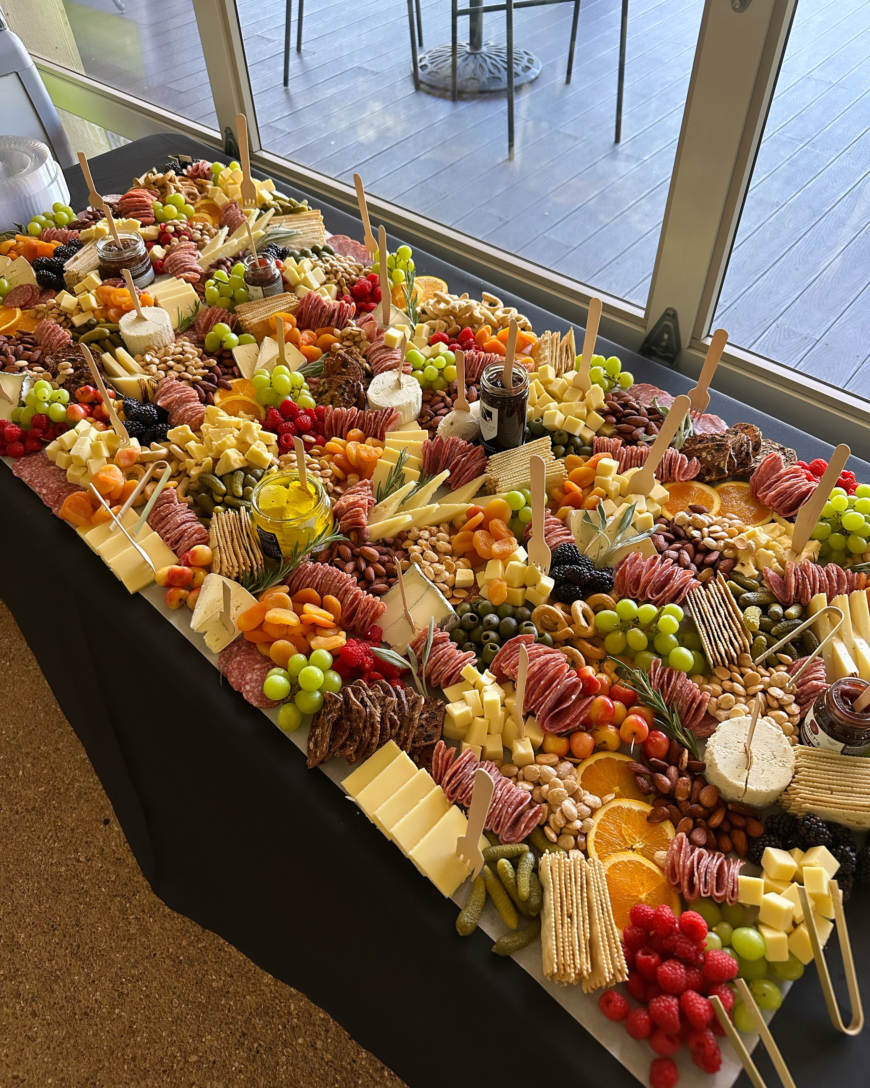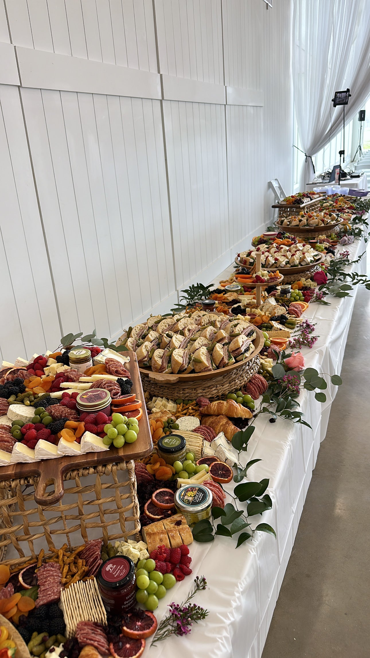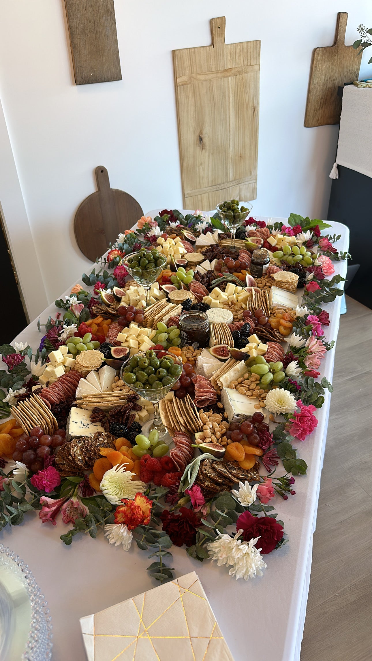 Our flat-lay grazing tables are set up directly on food-safe paper giving the appearance of an extremely large charcuterie board! All of our grazing tables include gourmet cheese & charcuterie, artisan crackers, fresh fruits & berries, olives, jams, and other seasonal ingredients! We require at least one hour of set up time before the start of your event!