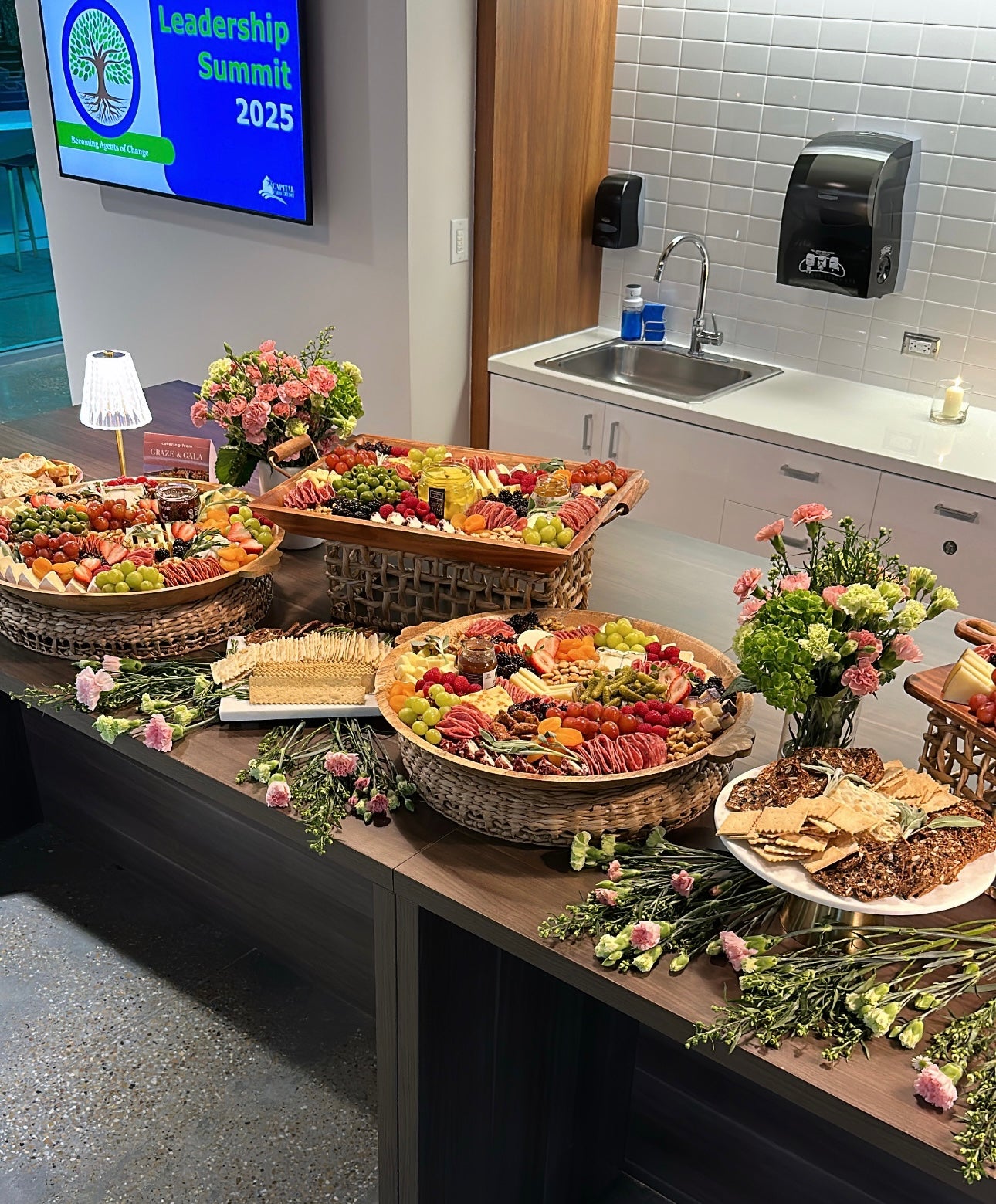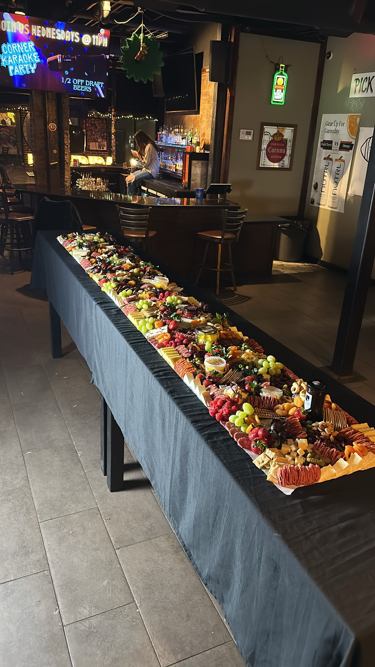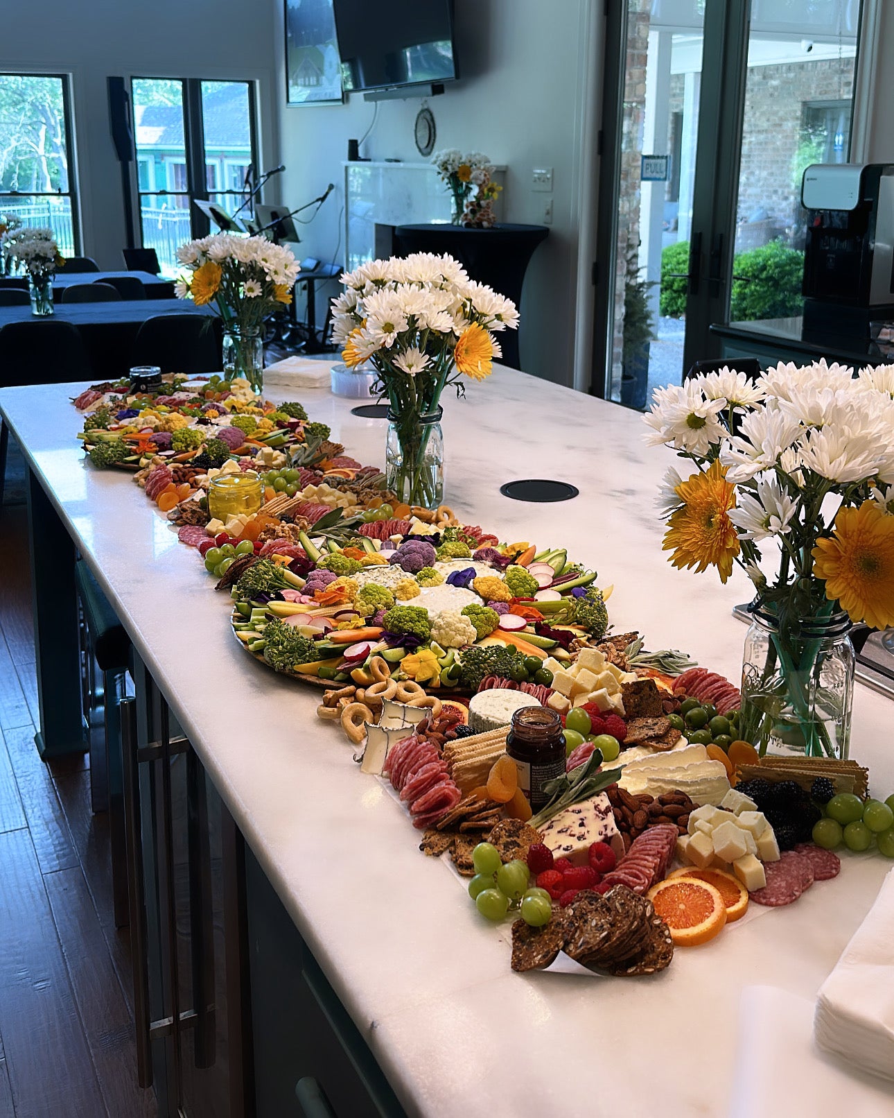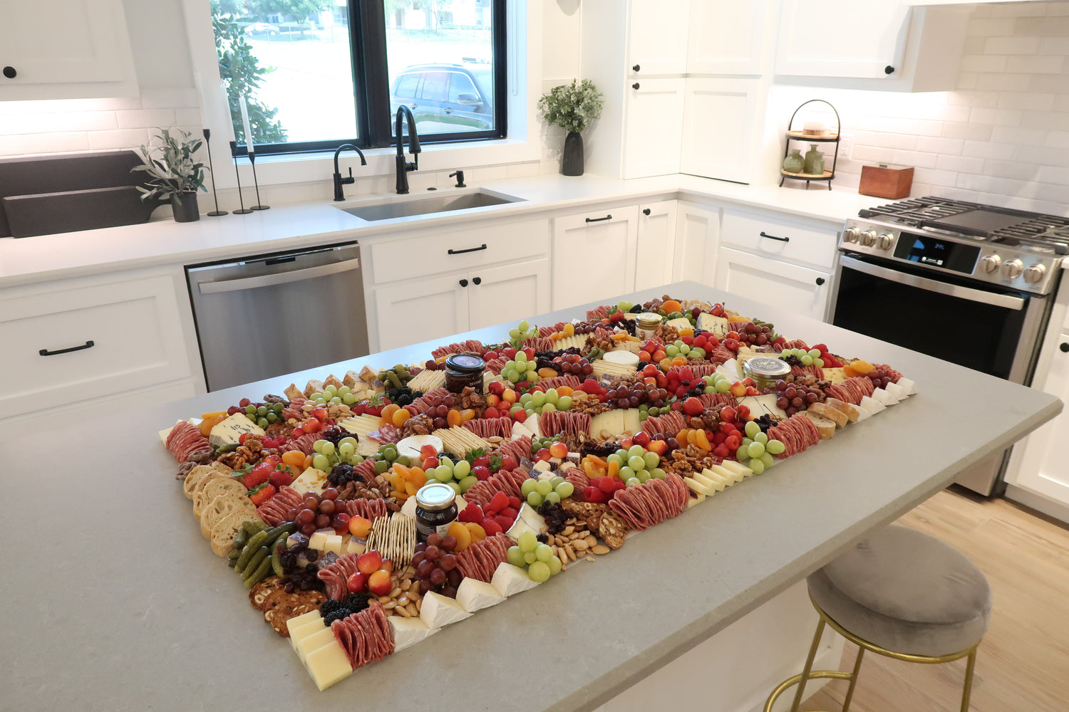 Our flat-lay grazing tables are set up directly on food-safe paper giving the appearance of an extremely large charcuterie board! All of our grazing tables include gourmet cheese & charcuterie, artisan crackers, fresh fruits & berries, olives, jams, and other seasonal ingredients! We require at least one hour of set up time before the start of your event!