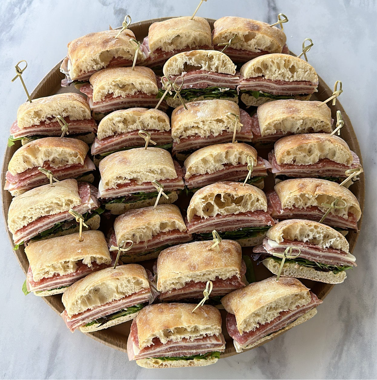 Prosciutto, Provolone, Italian Dry Salami, and Ham mixed with leafy spring mix and spinach greens with a Chardonnay Dijon Mustard on ciabatta bread
